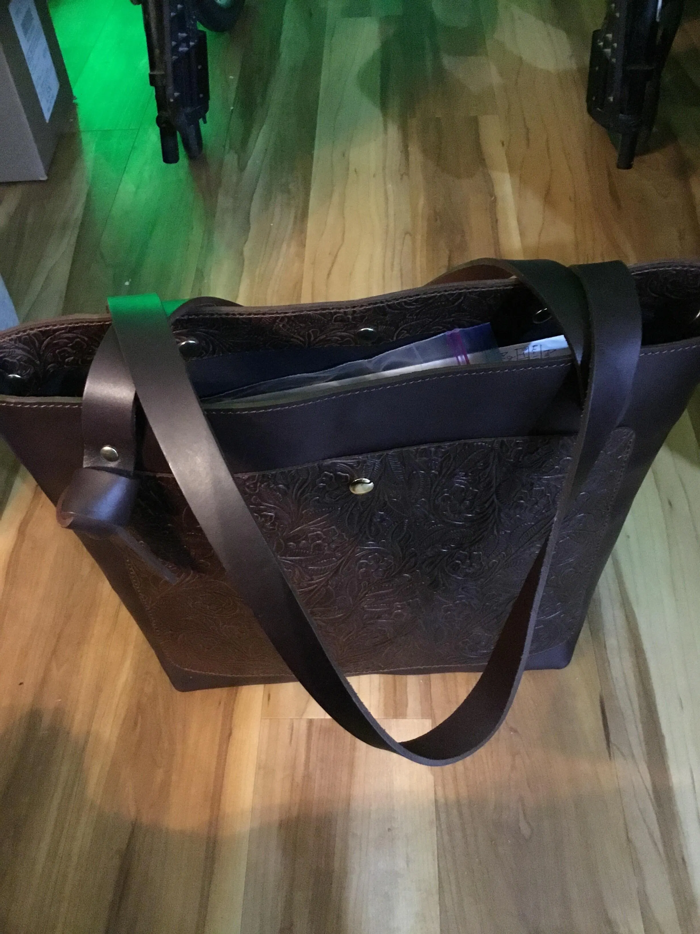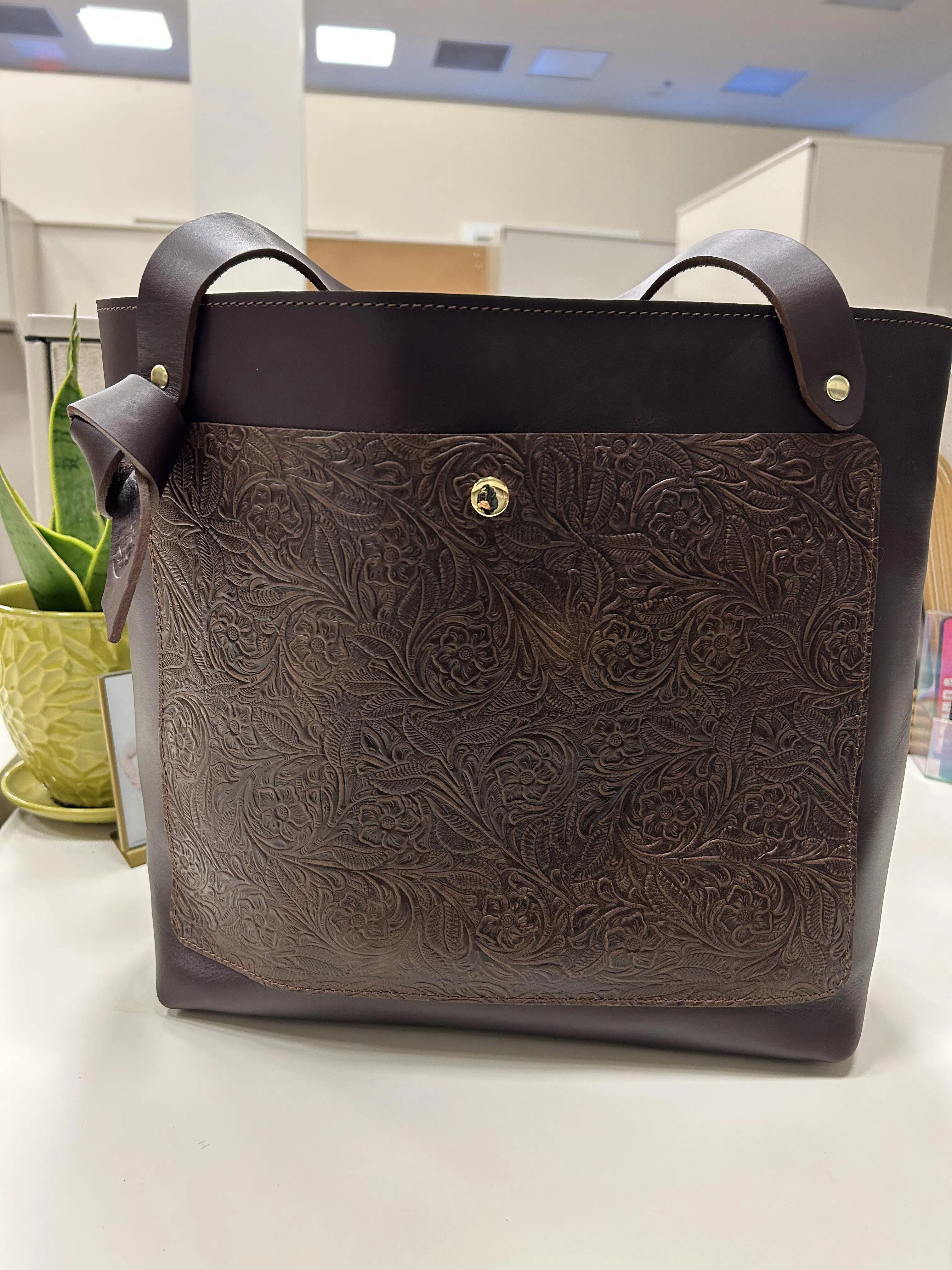 Love, love, love my new tote. I placed my custom order for a zipper pocket inside the lining of the tote. It was made exactly as discussed. The inside zipper pocket is a great place to store my phone and keys so that I can find them easily. There is plenty of room in the tote for all my necessities. The tote is extremely well made and the floral leather made it so beautiful! It is easy to sling over my shoulder or I can carry it by the handles without it touching the ground. I am extremely pleased with the quality, design, and customer service.